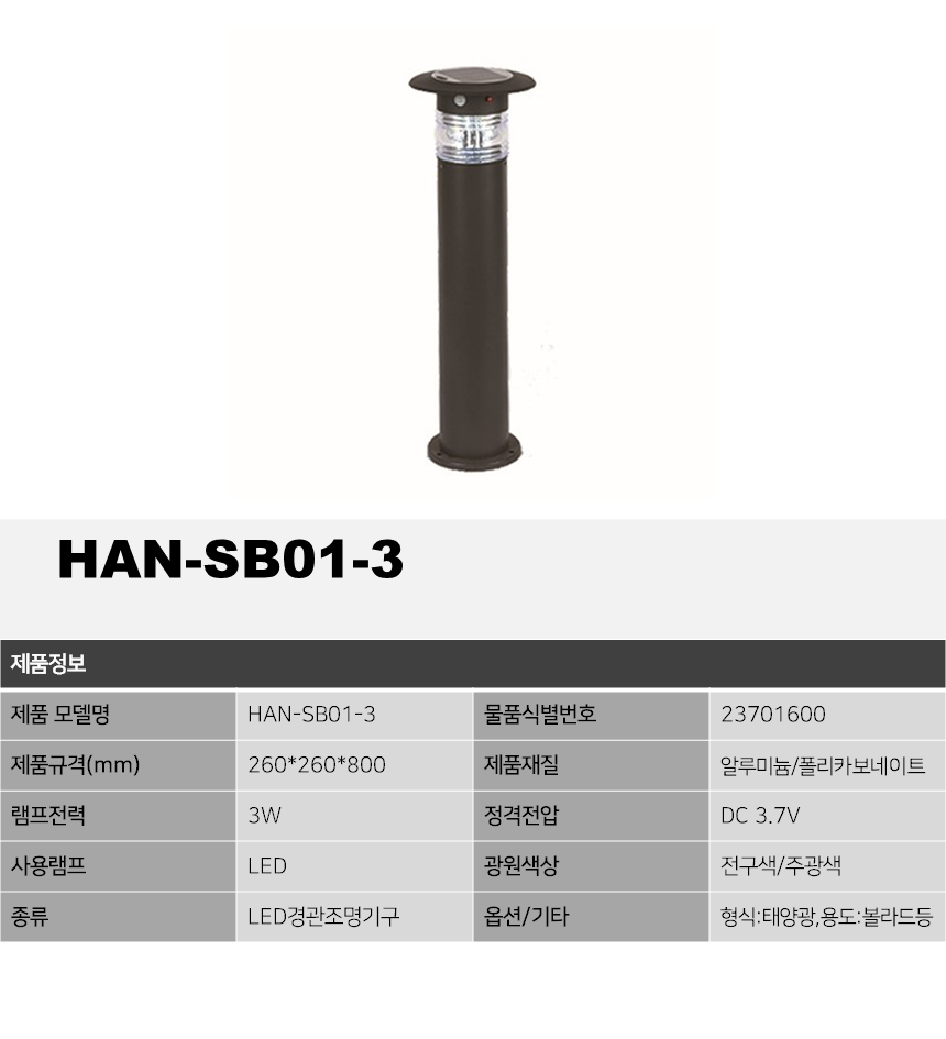 제품소개 LED조명 HAN-SB01-3, 3W 볼라드등 작성자 admin 작성일 2021-10-20 14:15 조회 2857 인쇄 « HAN-L10-14.4, 14.4W HANA-G108, 108W » 목록보기
