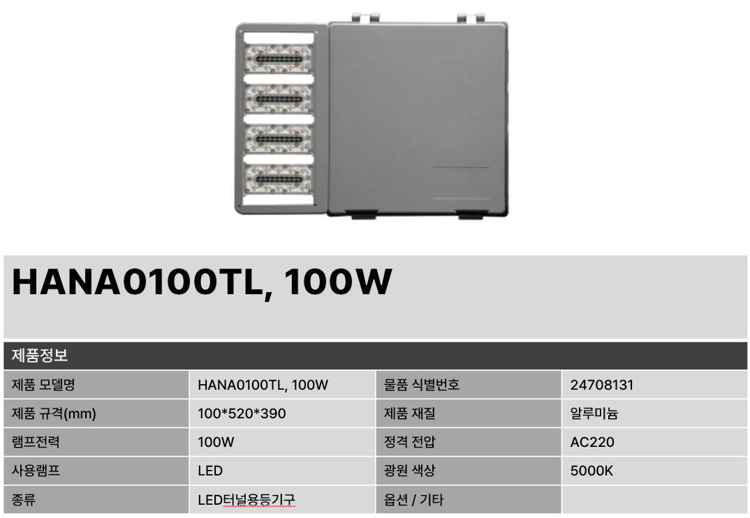 제품소개 LED조명 HANA0100TL, 100W 터널등 작성자 hananetworks 작성일 2025-07-30 02:23 조회 245 HANA0100TL, 100W 나라장터 바로가기 인쇄 « HANA0150TL, 150W HANA2525TL, 50W » 목록보기